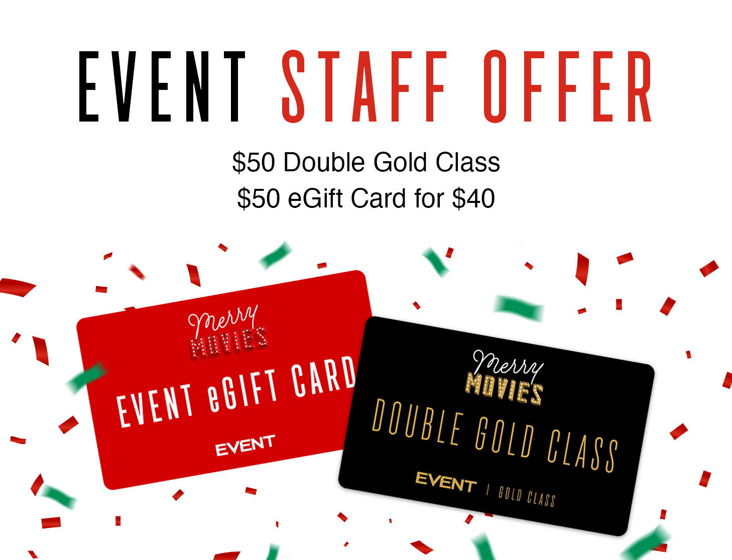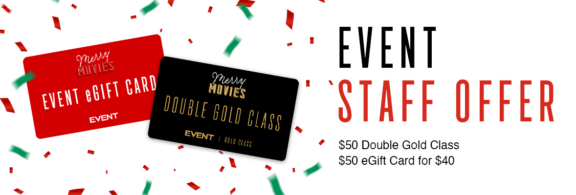 *An Event Gift Shop account will be required to complete purchase. eGift Cards are valid for redemption at Event Cinemas, BCC, GU Filmhouse & Greater Union locations. eGift Cards not valid for use in Victoria/Tasmania (excluding Moonlight Melbourne). Event Cinemas staff login details must be entered when prompted. For help accessing your staff login details CLICK HERE. This offer is available for online purchase only & must be purchased through the promotional page. See above for full product terms and conditions. Offer ends 11:59PM AEDT 25th December 2020.