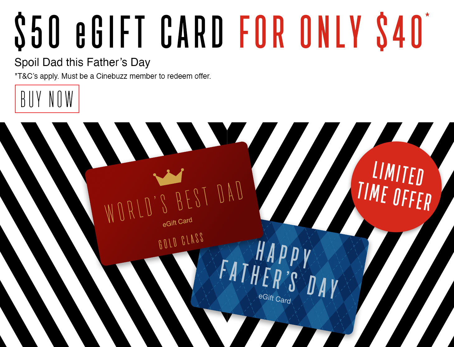 For a limited time only, Cinebuzz members can access our special eGift Card offer- get a $50 eGift Card for only $40!*